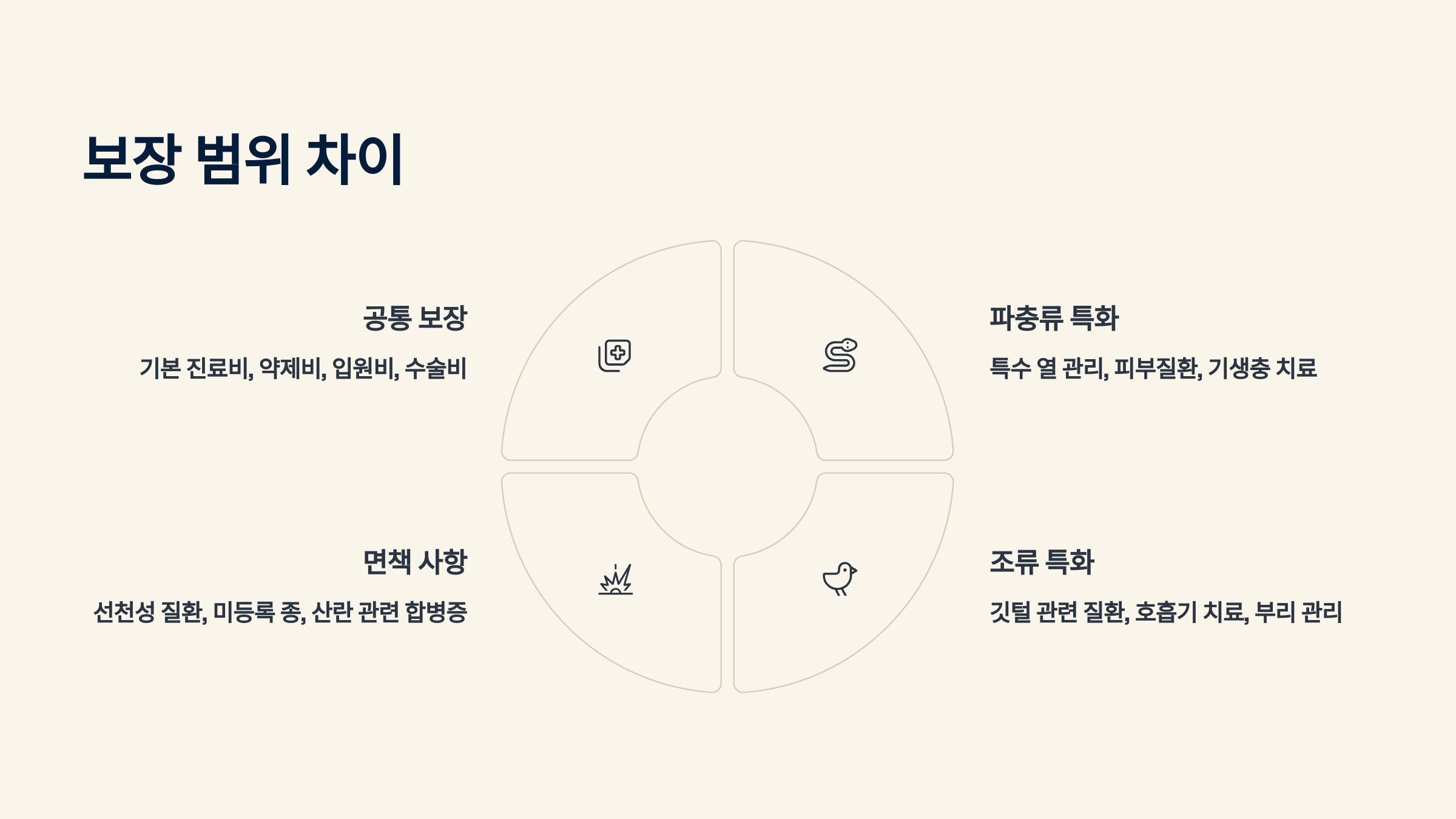 파충류는 병원 접근성이 낮아 입원보다는 외래 중심 보장이 많은 반면, 조류는 긴급성 질환이 많아 입원치료 위주의 보장이 적절한 편이에요. 이런 사용 패턴을 고려한 보험 설계가 필요해요. 🏥