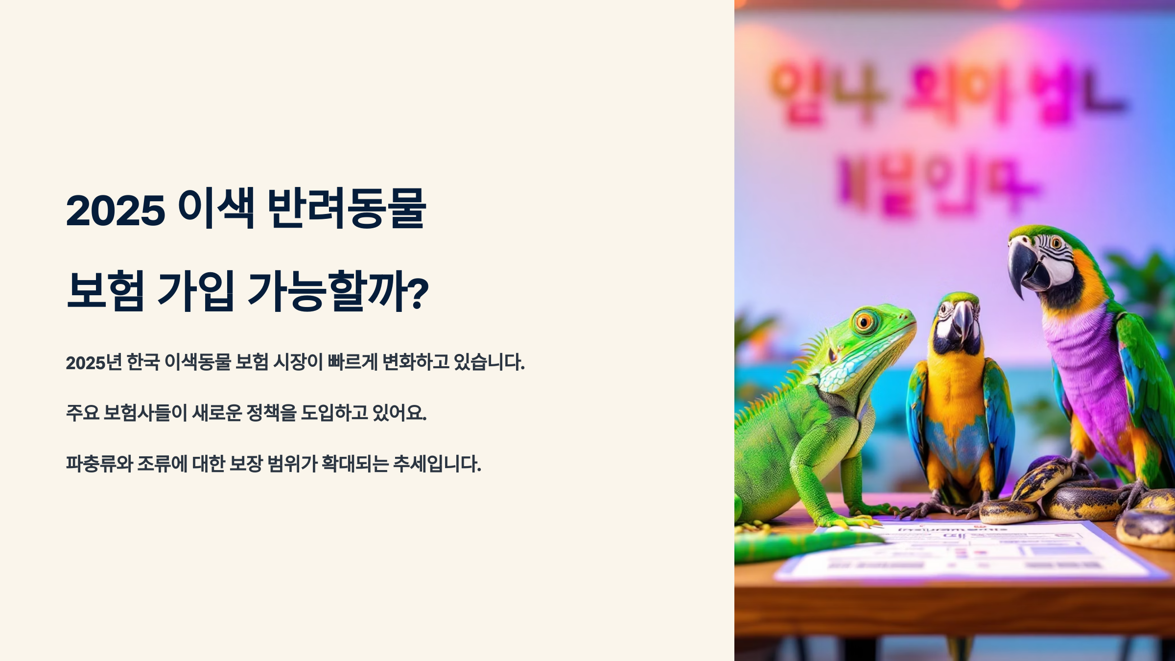 2025년 현재, 반려동물 보험 시장은 점점 더 확대되고 있지만 아직도 강아지, 고양이를 중심으로 구성되어 있어요. 하지만 사회 전반에서 이색 반려동물을 기르는 인구가 늘어나면서, 보험 시장도 조금씩 움직이고 있는 중이에요. 🐍🦎🦜
