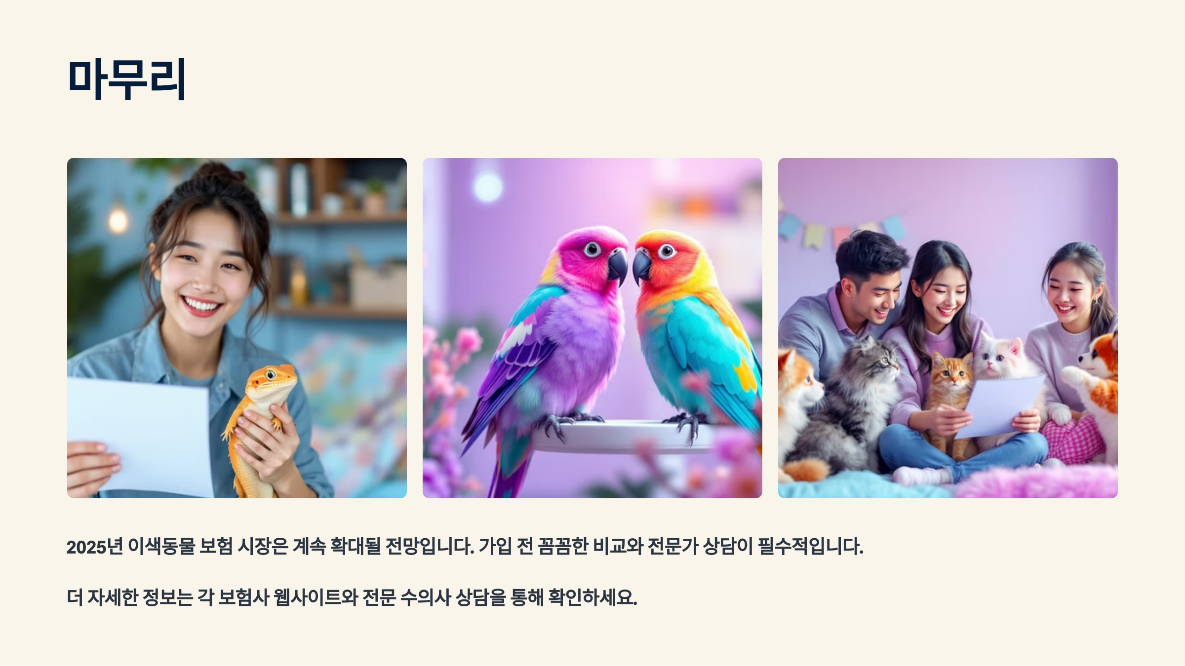 제가 생각했을 때, 이색 반려동물 보호자들도 똑같이 사랑과 책임을 가지고 돌보고 있는데, 보험 서비스는 아직 그 속도를 따라가지 못하는 것 같아요. 지금의 정보가 앞으로 바뀔 보험 환경에 작은 도움이 되었으면 해요. 💬
