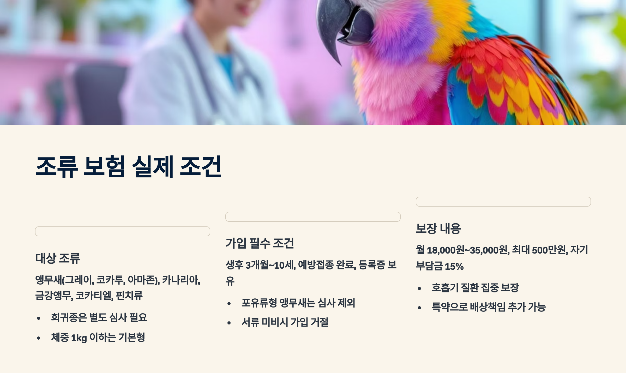 다음은 🦜 조류 보험 실제 조건으로 넘어가볼게요! 앵무새나 잉꼬를 키우시는 분들이라면 꼭 주목해주세요. 가입 조건과 가능한 보장 항목을 구체적으로 알려드릴게요!