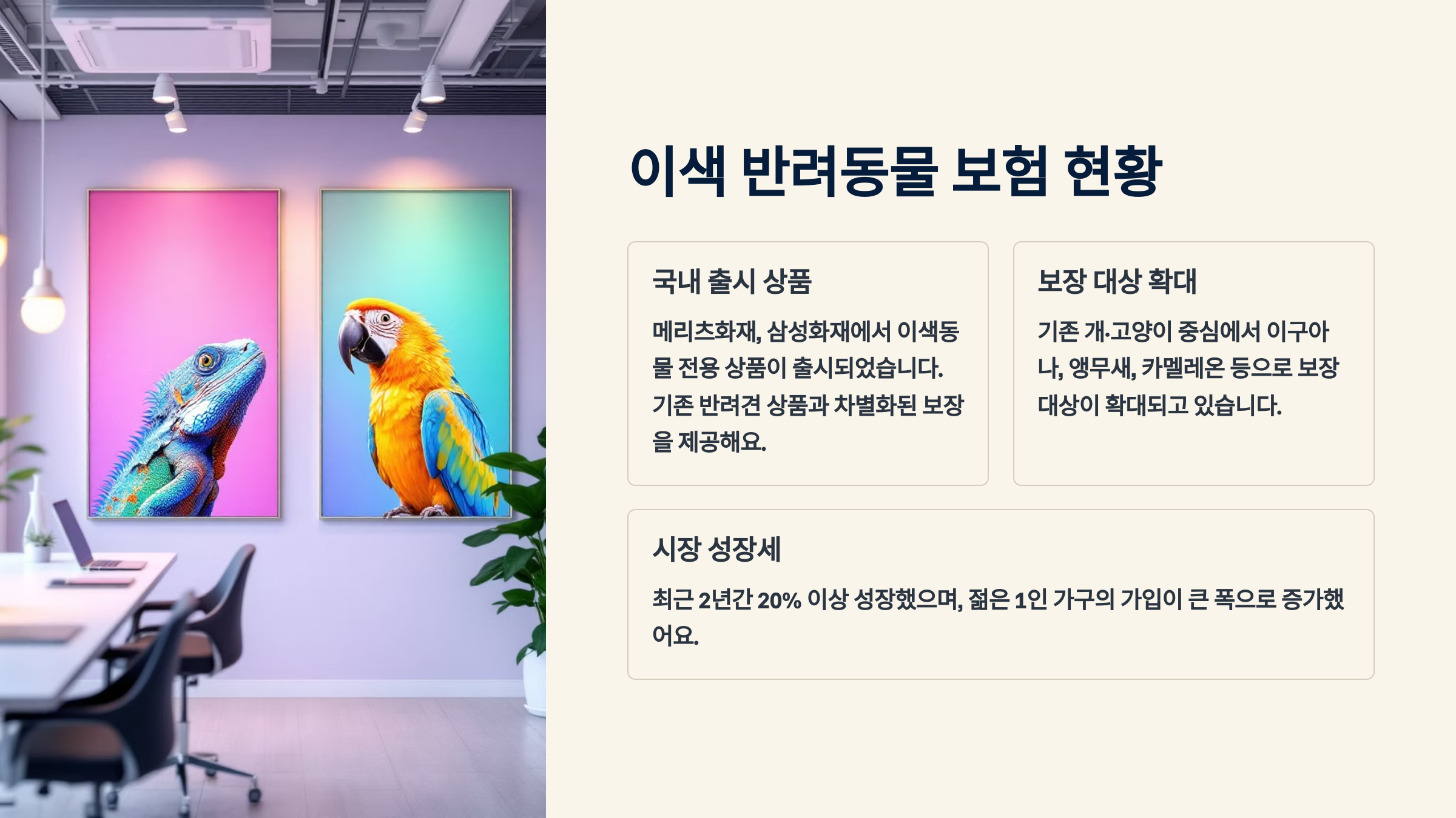 이색 반려동물도 점점 가족의 일원으로 자리 잡아가고 있어요. 레오파드게코, 앵무새, 육지거북 등 다양한 동물을 사랑으로 키우는 보호자들이 늘고 있는 만큼, 이제는 보험의 영역도 확장될 필요가 있어요. 🐢🦜