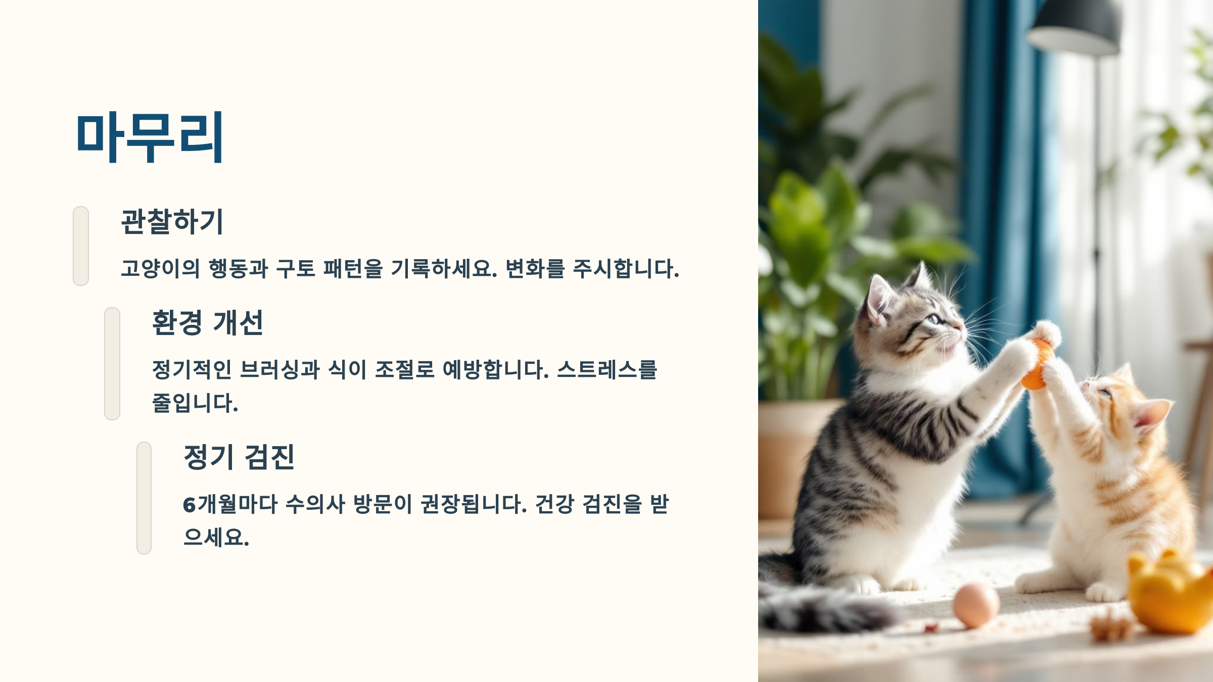 고양이의 몸은 민감하기 때문에 작은 변화에도 민감하게 반응합니다. 따라서 보호자가 세심하게 관찰하고 꾸준히 케어하는 것이 최고의 예방책이자 치료입니다. 🙏🐱