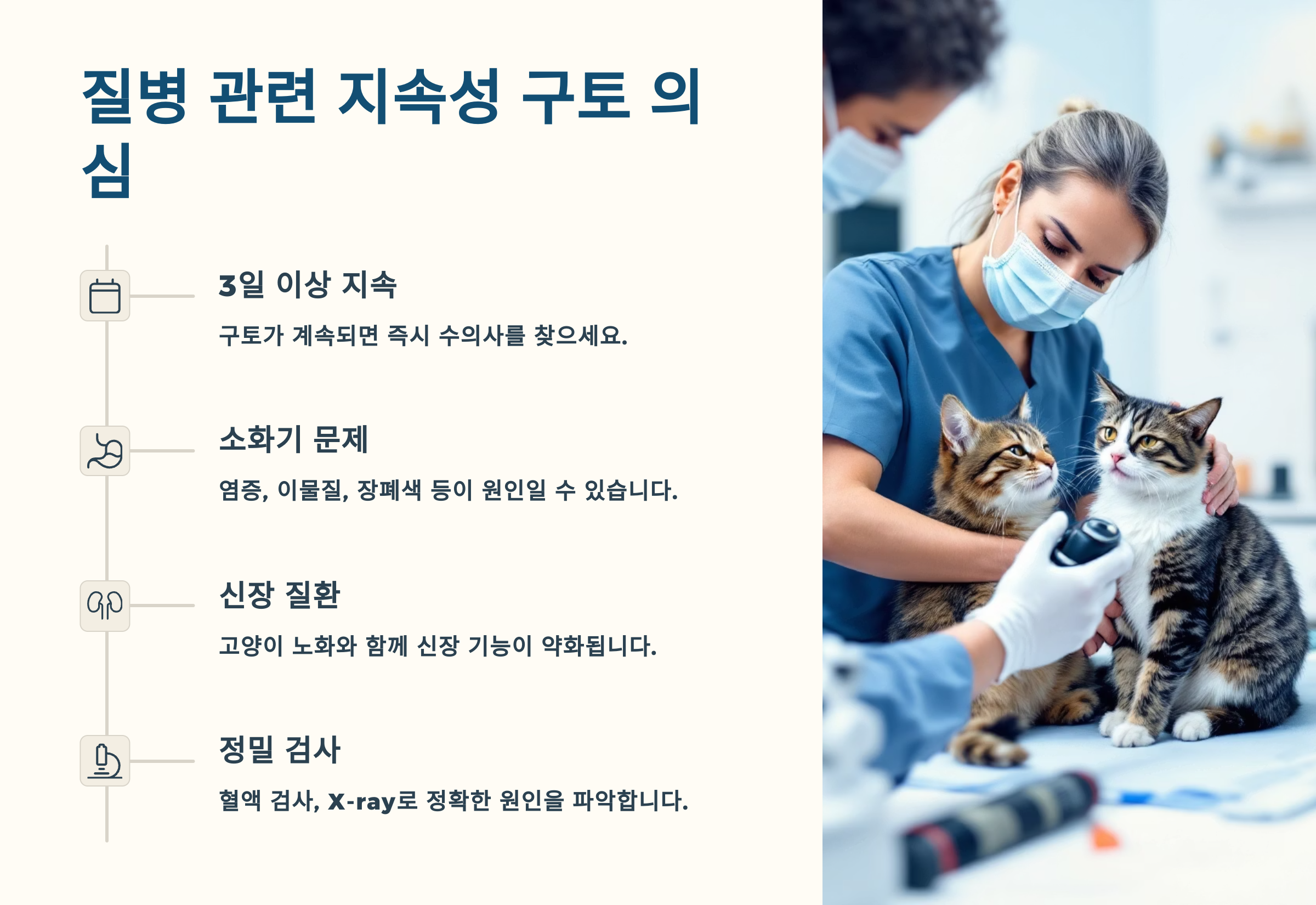 - 기저 질환: 만성 신부전, 갑상선 질환, 당뇨병 등도 반복적인 구토의 원인이 될 수 있습니다. 혈액검사와 소변검사로 조기 진단이 가능합니다.