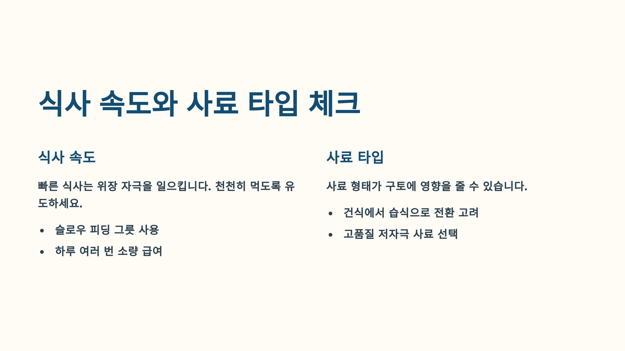 다음은 식사 습관과 사료 문제를 살펴볼게요. 🍽️