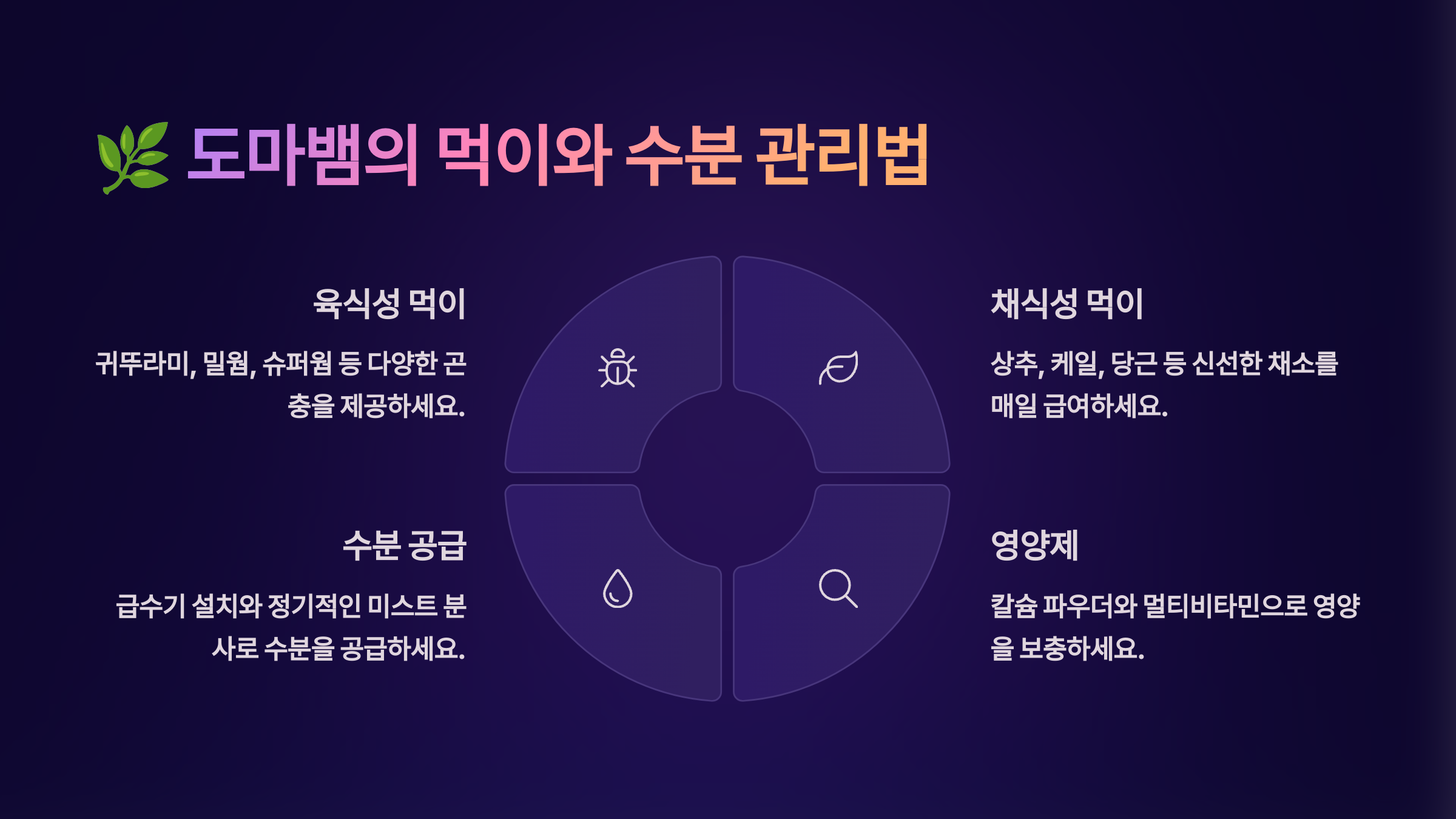 이제 🌿 도마뱀의 먹이와 수분 관리법으로 넘어가서 품종별로 어떤 먹이를 주고 어떻게 급수해야 하는지 안내해드릴게요!