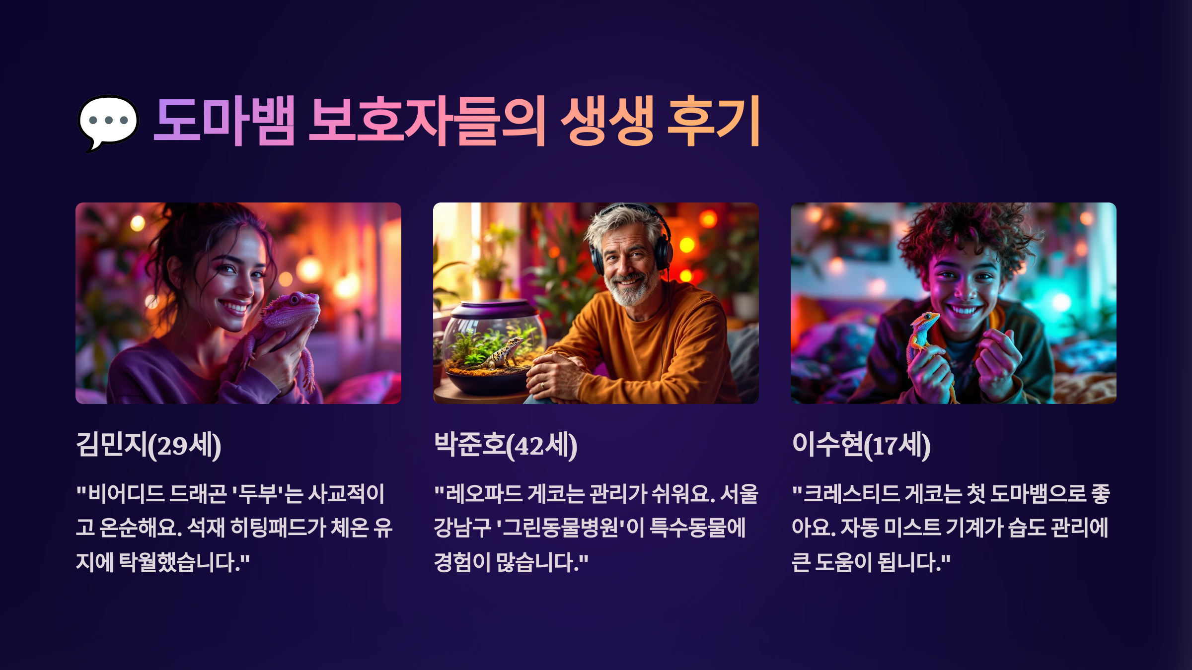 이제 💬 도마뱀 보호자들의 생생 후기 섹션으로 넘어가서 실제 보호자들이 겪은 경험을 함께 살펴볼게요!