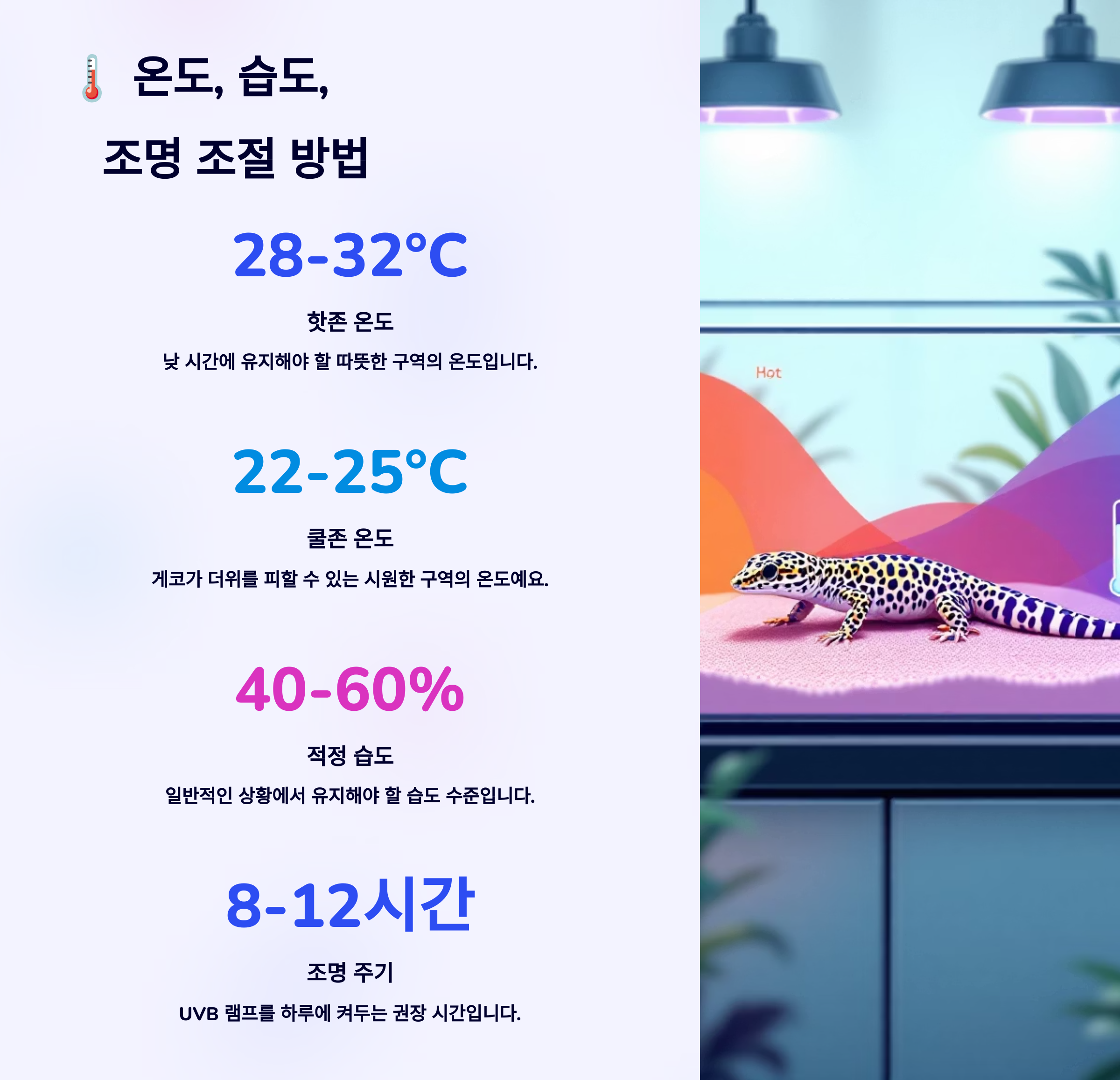 이제 다음 섹션에서는 레오파드게코 사육의 핵심! 온도, 습도, 조명 조절 방법에 대해 알려드릴게요! 🌡️🌞💡
