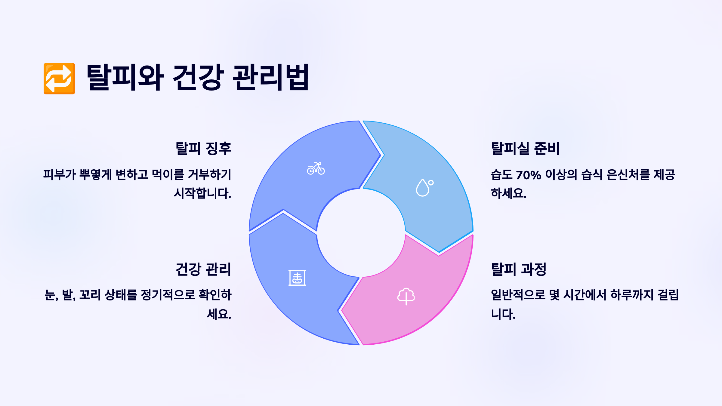 건강한 탈피는 전신이 한 번에 벗겨지고, 남은 껍질이 없고, 아이가 스트레스를 받지 않는 상태예요. 반대로 껍질이 일부만 남거나, 눈이나 발가락에 달라붙어 있으면 도움이 필요하다는 신호랍니다! 🆘
