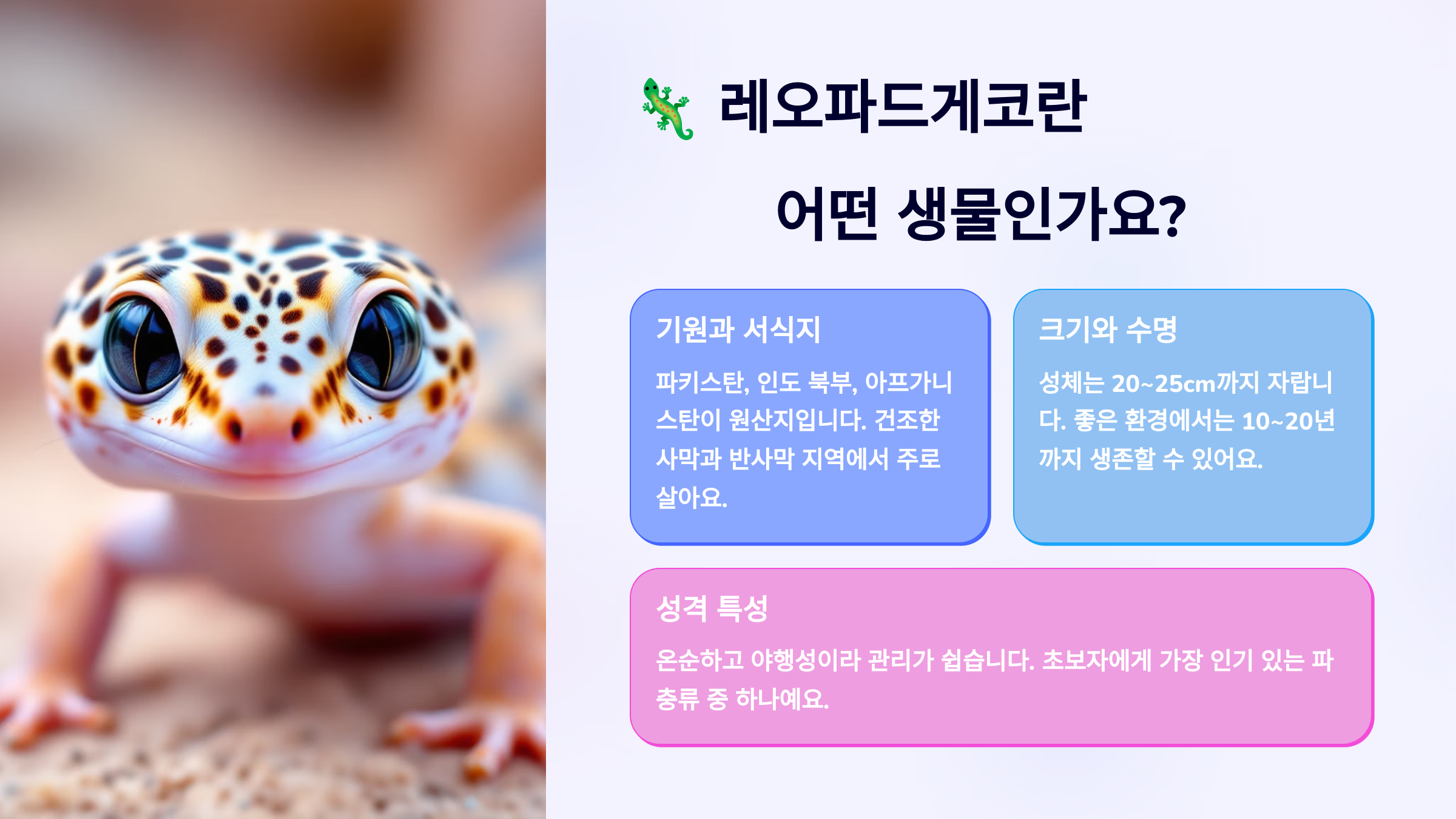 레오파드게코는 작고 조용하지만 생각보다 섬세하고 교감이 깊은 존재예요. 이 작은 친구와 함께한다는 건 단순한 반려가 아니라 작은 생명을 존중하고 함께 살아간다는 선택이기도 해요 🦎❤️