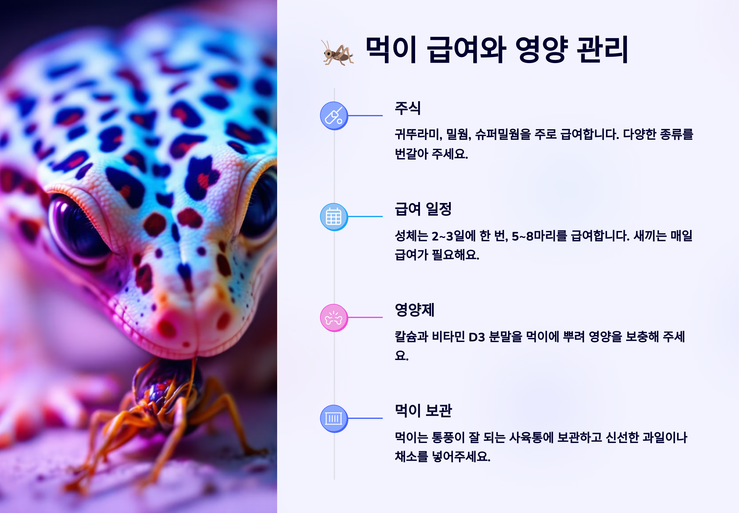 이제 다음 섹션에서는 레오파드게코의 건강과 성장을 위한 먹이 급여와 영양 관리를 알려드릴게요! 🦗🥄