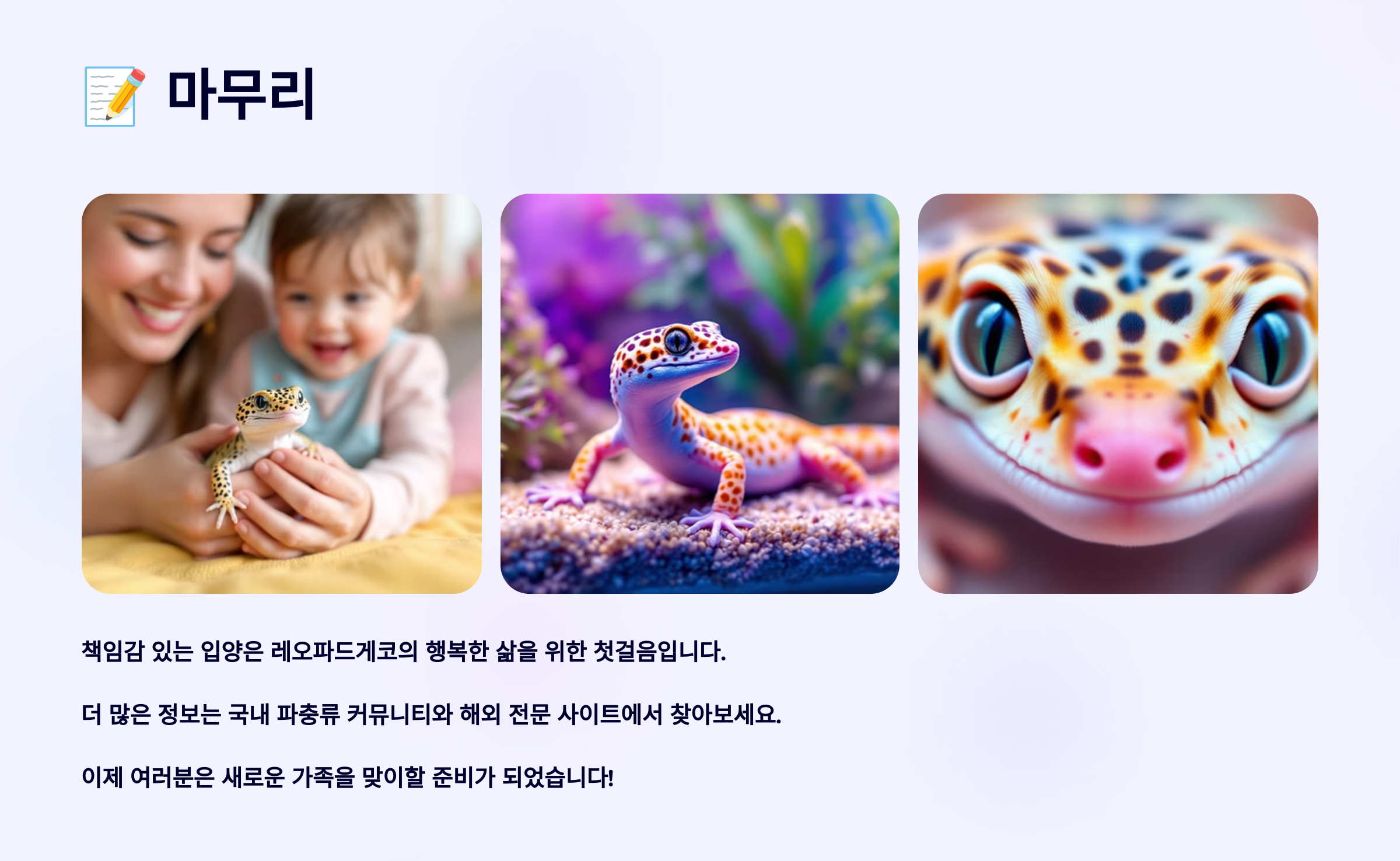 이제 레오파드게코와의 하루하루가 더 소중하고 즐거운 시간이 되기를 진심으로 응원할게요! 궁금한 게 생기면 언제든 물어봐주세요. 우리 귀요미를 위한 따뜻한 집사가 되어봅시다~ 🦎✨