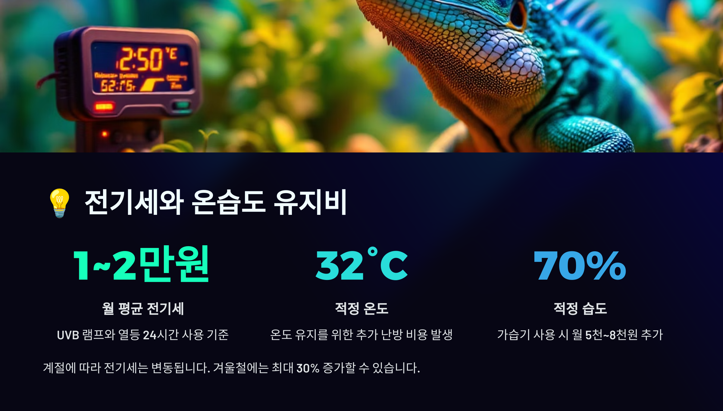 처음에는 사육장 세팅, 조명 장비, 기본 구조물 등 구매가 집중되는 초기 투자 비용이 있지만, 그 이후에는 전기세, 먹이비, 교체용품, 병원비가 지속적으로 들어가요. 즉, 유지 관리비가 핵심이라는 말이죠! 🔧