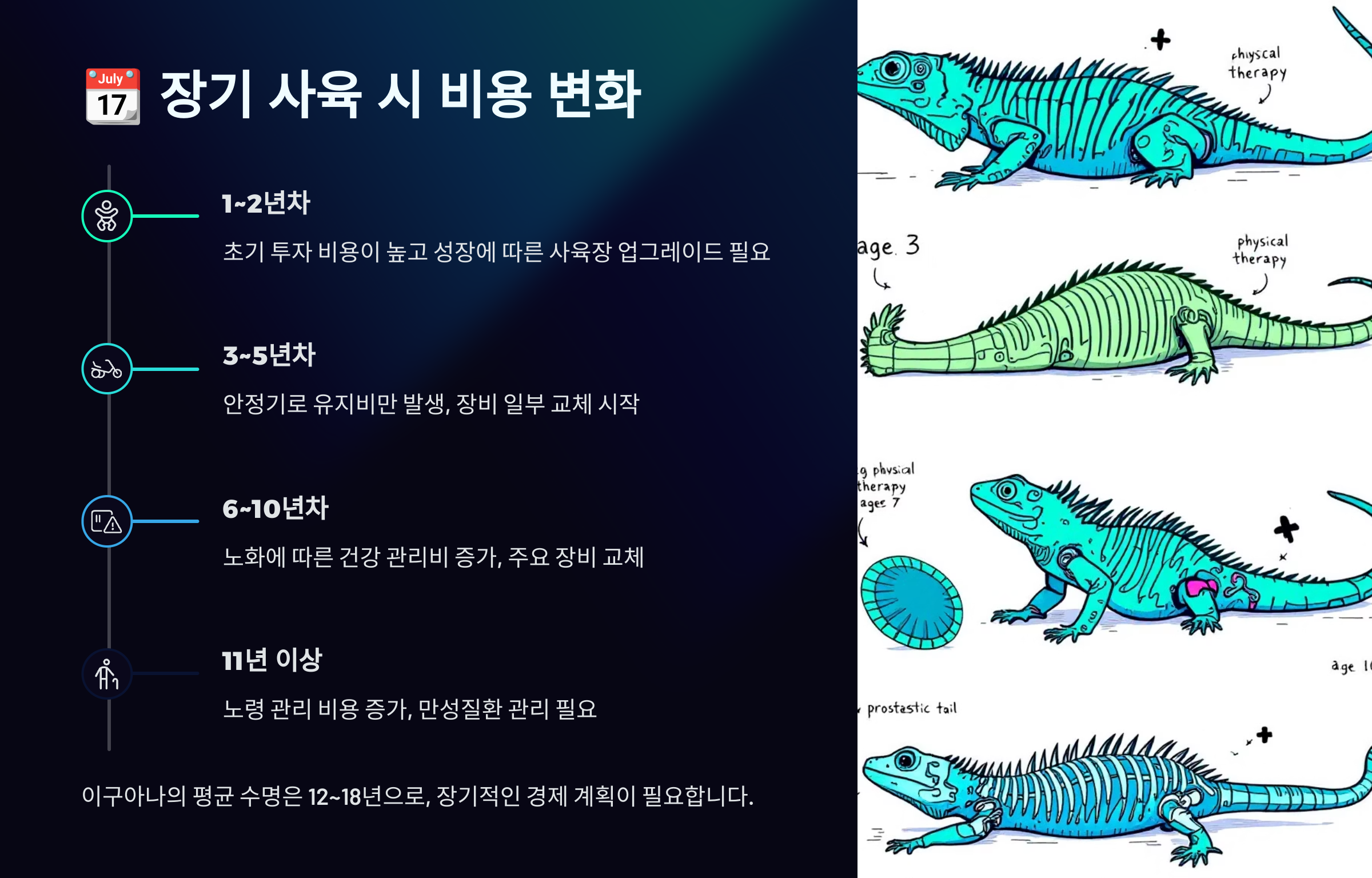 이구아나는 단기 반려동물이 아니에요. 평균 수명이 10~15년, 잘 키우면 그 이상도 가능해요. 그래서 초반보다 오히려 3년 차 이후부터 진짜 관리가 중요해요! 🔁