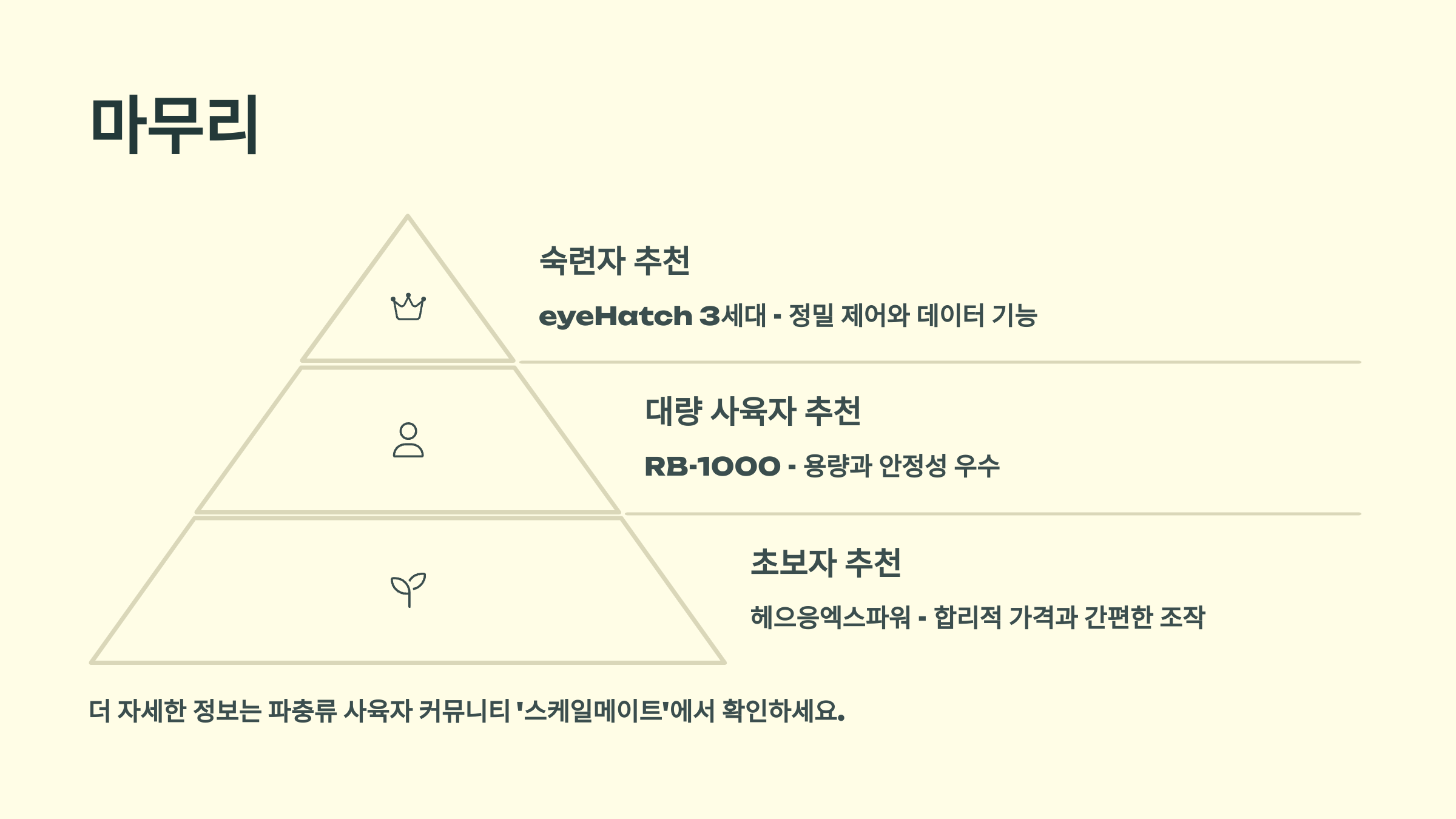 내가 생각했을 때, 인공배양기를 고르는 기준은 기능의 다양성보다 알을 얼마나 안정적으로 보호해줄 수 있느냐인 것 같아요. 환경이 안정되면 그 안에서 생명이 잘 자라고, 건강한 유체로 세상에 나올 확률도 높아지거든요.