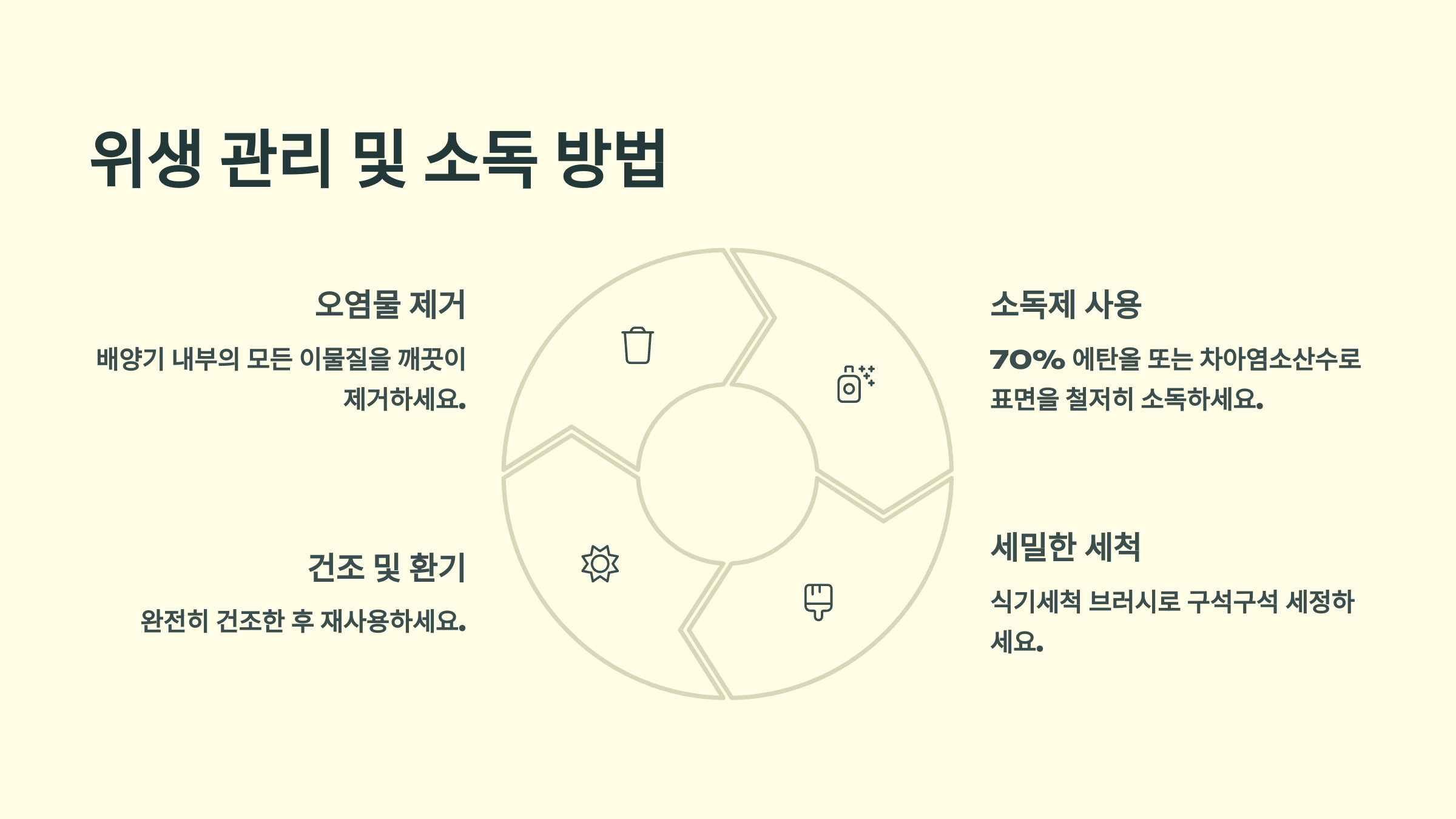 아래는 위생 관리를 위해 꼭 확인해야 할 사항을 정리한 표예요. 다음은 ⚠️ 배양 중 흔한 실수와 해결책을 안내해드릴게요!