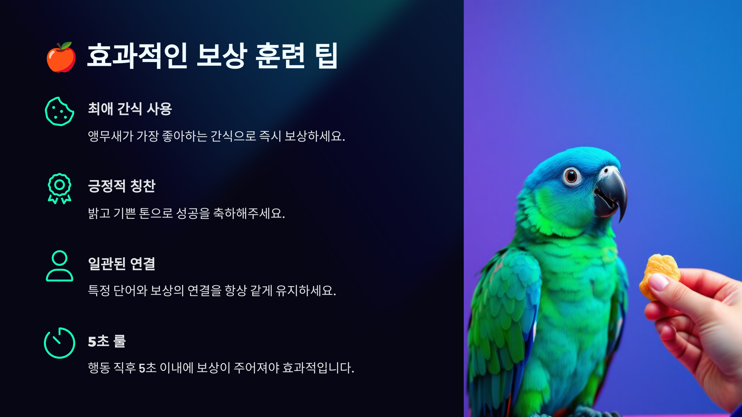 보상 훈련은 앵무새가 ‘이 소리를 내면 좋은 일이 생긴다!’는 것을 인식하게 하는 가장 강력한 방법이에요. 훈련에 성공한 앵무새 대부분이 보상을 통해 흥미와 반복을 끌어낸 경우예요.