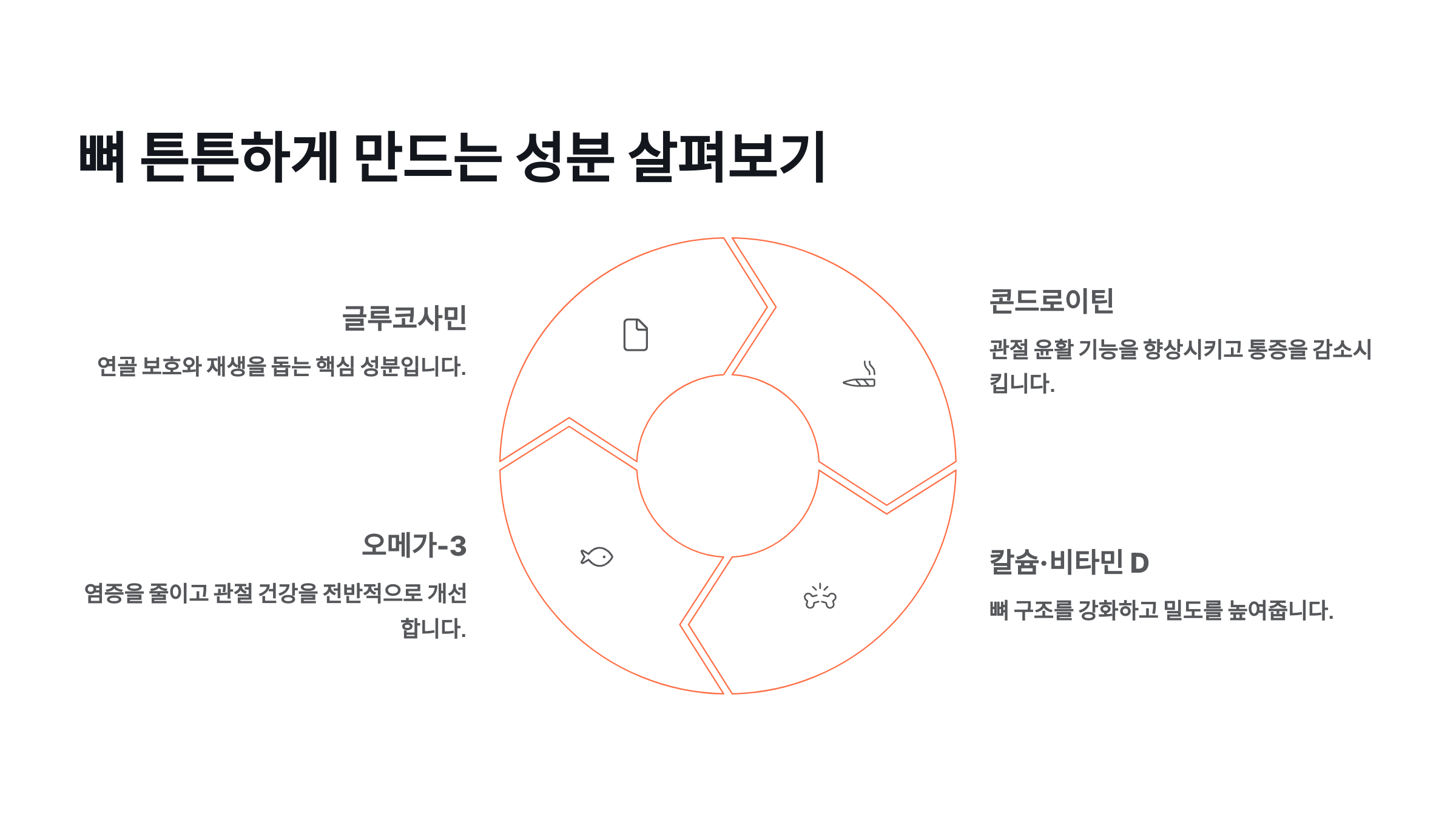이제 다음 섹션에서는 관절과 뼈 건강에 좋은 성분들을 하나하나 살펴볼게요. 어떤 성분이 어떻게 작용하는지 궁금하시죠? 함께 보러 가요! 🔍🧪